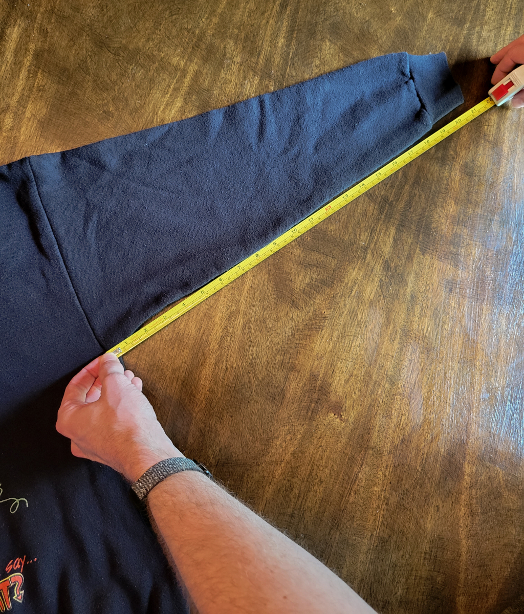 Sleeve length will always be measured underneath the sleeve, from the armpit seam to the end of the wrist hem. This makes the measurement easier for tops without shoulder seams, like raglan sleeves.