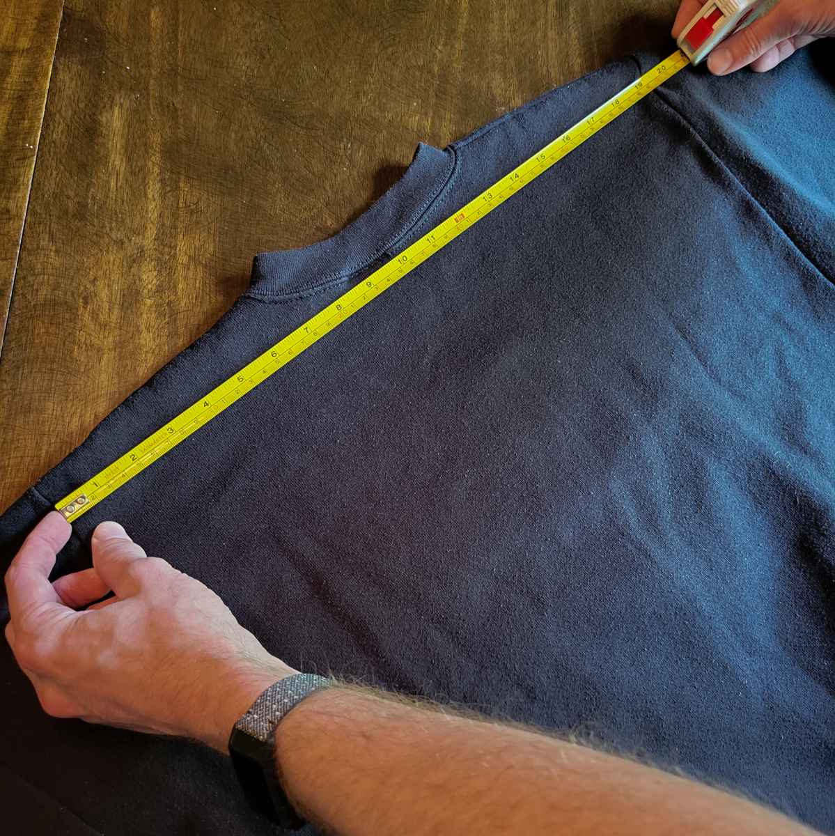 Shoulder width should be measured horizontally across the back of the shirt. Measure from one shoulder seam to another.